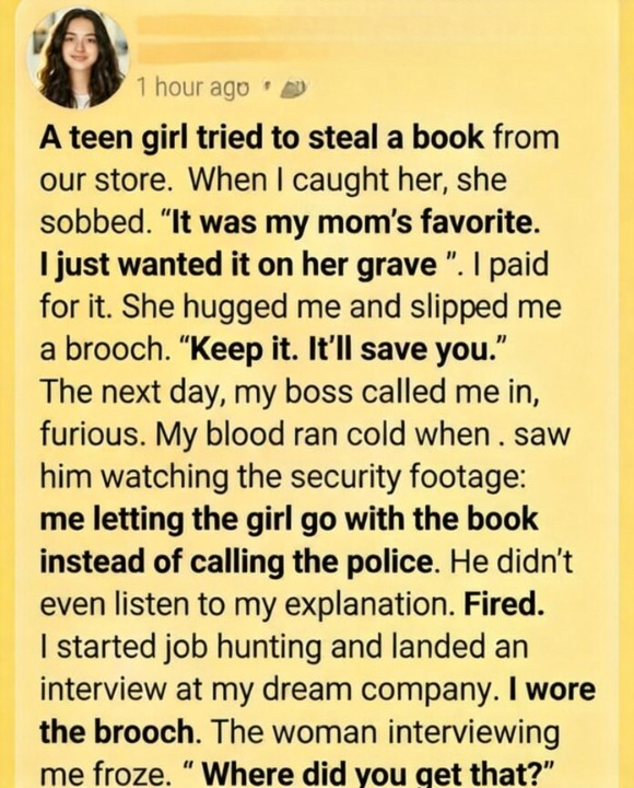 Suddenly, policy felt hollow. I gently took the book from her bag, carried it to the counter, and paid for it myself without a second thought. She looked at me as if I’d rescued her from something far heavier than punishment. Then she hugged me—tight, trembling, grateful. Before leaving, she pressed a small object into my palm: a silver flower brooch set with a vivid blue stone. She said it had been her mother’s lucky charm and insisted it belonged with me now. I tried to give it back, but she was already retreating toward the door, offering one last fragile smile before vanishing.