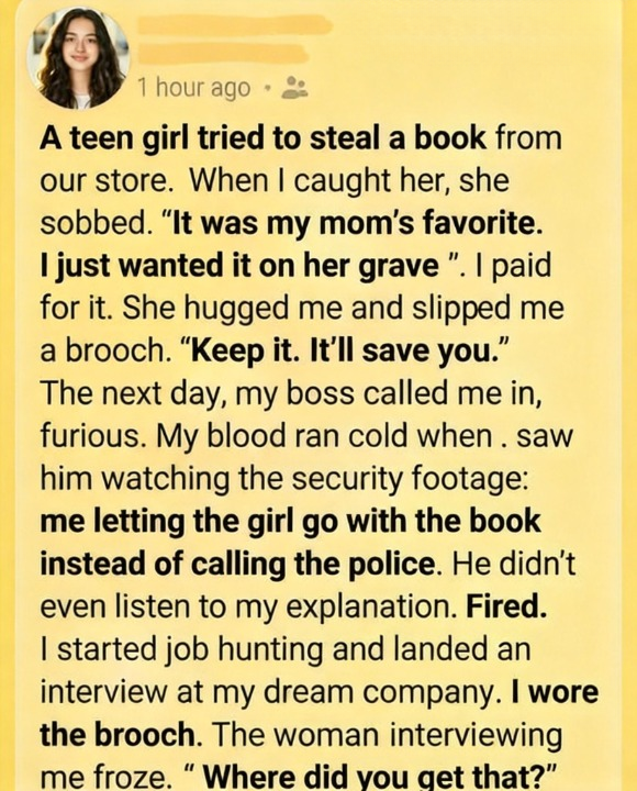 That small act of kindness cost me a job—but it gave me another. More than that, it helped reunite a fractured family and quietly redirected my entire life, all because of one stolen book, one gifted brooch, and a choice made in a silent bookstore aisle.