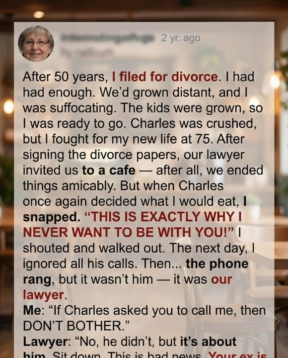 After fifty years of marriage, Margaret felt she had finally run out of emotional energy. Her children were grown, the house felt empty, and the quiet distance between her and her husband, Charles, had turned into deep loneliness. After a lifetime of putting others first, she chose to file for divorce, hoping to rediscover herself and find peace in her later years.