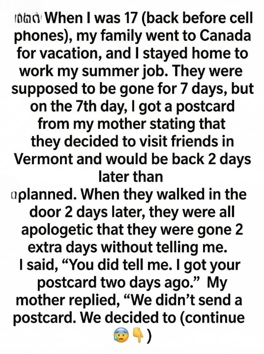 Two days later, my family came home—sunburned, tired, and happy. I held up the postcard, laughing about the surprise detour. My mom’s smile faded as she studied it.