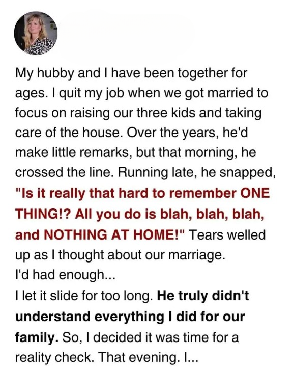 After we married, I left my job to stay home and manage the household. At the time, it felt like the right decision for our family.