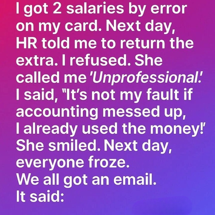 By mistake, two salaries were deposited into my account. The following day, HR contacted me and asked that I return the extra payment. I refused.