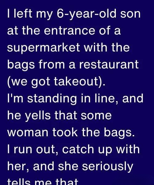 I left my six-year-old son near the entrance of the supermarket, holding the takeout bags from a restaurant while I waited in line at the checkout.