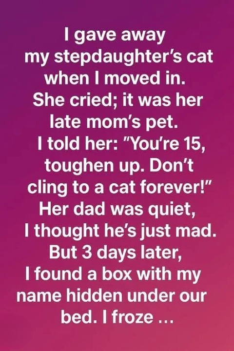When I moved in, I gave away my stepdaughter’s cat. She cried—it had belonged to her late mom. I thought I was helping her toughen up and said, “You’re 15. You can’t cling to a cat forever.” Her dad stayed silent, and I assumed he was just annoyed.