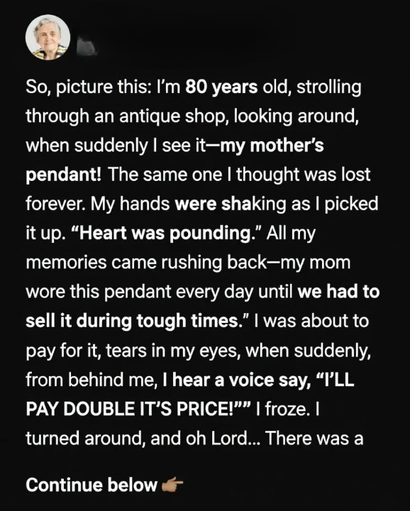 An 80-year-old woman was stunned when she unexpectedly discovered her late mother’s cherished pendant in a small antique shop. She immediately decided to purchase it, but just as she was about to pay, a stranger stepped forward and offered twice the price. Moments later, she realized who the person was—and tears filled her eyes.
