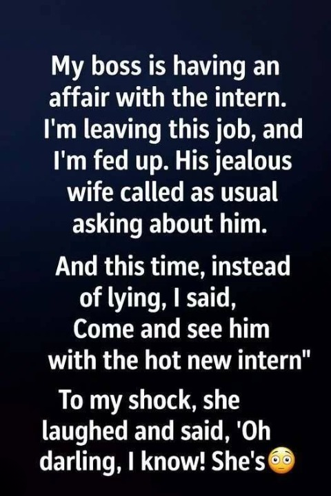 I felt worn down by all the secrets, the rumors, and the uncomfortable tension in the office. Without thinking too much about it, I calmly told her, “You could always come by and see for yourself. He’s here right now—with the new intern.”