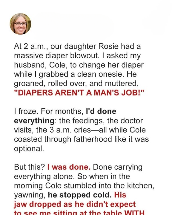 My husband, Cole, refused to change our baby’s diapers. “That’s not a man’s job,” he said, rolling over while I stood exhausted, heartbroken, with our daughter crying in the next room. That night, I didn’t argue.