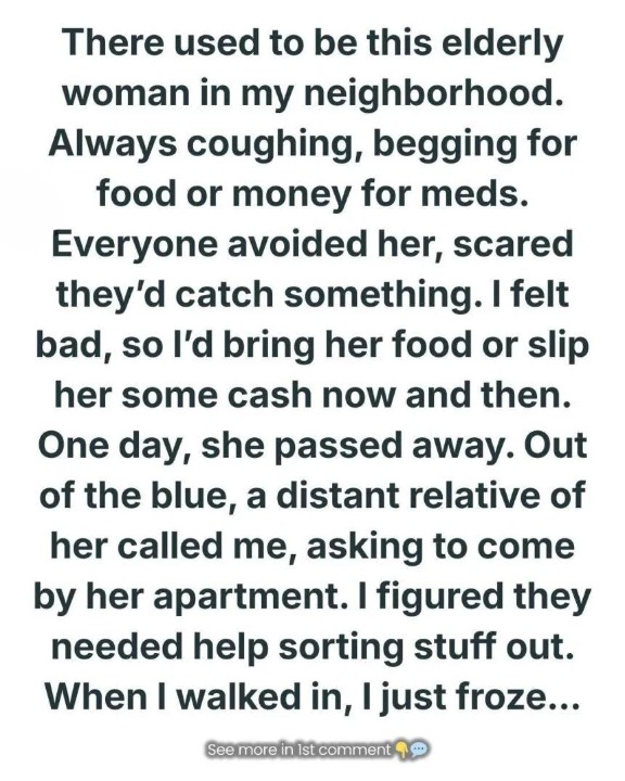 I, however, felt a quiet sympathy and occasionally brought her meals or slipped her a few dollars. Then one day, I learned she had passed away. A distant relative called unexpectedly and asked me to visit her apartment.