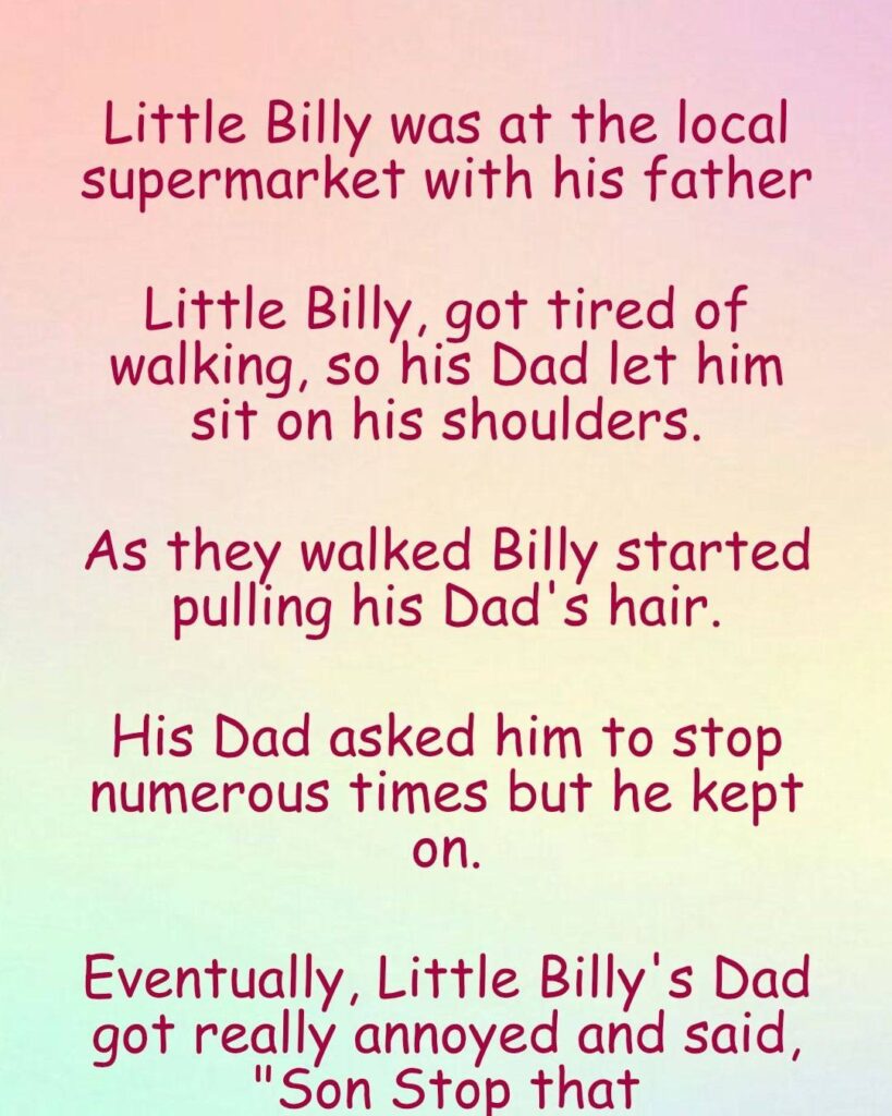 Little Billy got tired at the supermarket, so Dad let him ride on his shoulders. Suddenly, he started pulling Dad’s hair nonstop. Dad finally yelled, “Billy! Stop that right now!” Billy looked down and said, “But Dad… I’m just trying to get my chewing gum back!” 😂