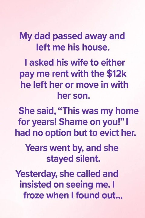 When she arrived, she looked older and more peaceful than I remembered. In her hands she held a small envelope that trembled slightly as she passed it to me. She admitted that she had spent years feeling angry — not because I had asked her to leave, but because my father’s death had left her feeling lost and unprepared for such a sudden change.