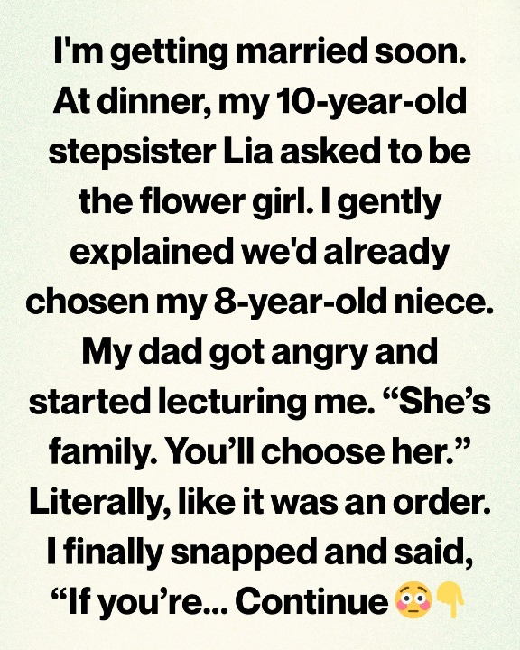 I’m getting married soon, and until a few nights ago, I thought the biggest stress I’d be dealing with was seating charts and flower arrangements. That night, we were all out to dinner—my dad, my stepmom, my ten-year-old stepsister Lia, and me. It was one of those rare dinners that actually felt calm.