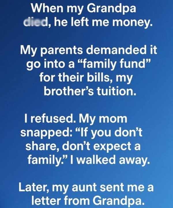 When my grandfather passed, I discovered he had left me an inheritance. Before I could process it, my parents insisted that the money should go toward household expenses and my brother’s education. They spoke urgently about fairness, responsibility, and family priorities. I understood their perspective, but something inside me resisted. It wasn’t selfishness—just a quiet unease.