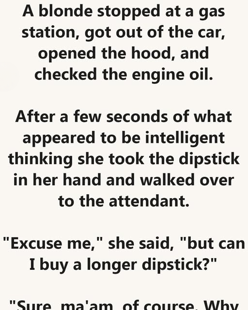 A blonde woman pulled into a gas station, stepped out, opened the hood, and checked the oil. After a moment of thinking, she removed the dipstick and walked over to the attendant.