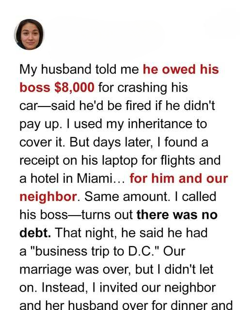 A few days later, while using his laptop to look up a recipe, I stumbled on a file: “Tickets_Miami.pdf.” Two plane tickets, a hotel reservation, eight days, totaling $7,983. Mike—and Sarah, our neighbor who always borrowed sugar and chatted about her kids. My heart sank.
