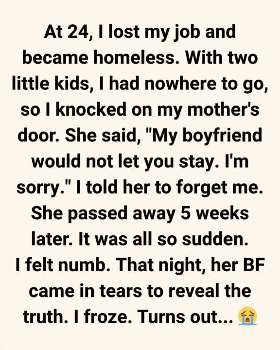 At twenty-four, I lost my job—and with it, any sense of stability. With two young children relying on me, I ran out of options and, despite my pride, went to my mother’s house. When she opened the door, she looked thinner than I remembered, her eyes tired but still kind.