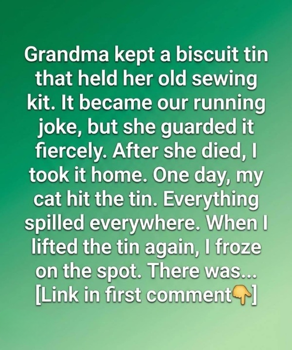 Weeks later, while cleaning, my cat jumped onto the shelf and knocked the tin to the floor. The lid popped off, scattering buttons and spools of thread across the room. As I knelt to gather the mess, something caught my eye.