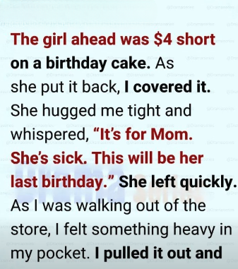 The girl at the register couldn’t have been older than ten. She held a small chocolate birthday cake, the frosting uneven, little plastic flowers on top. When the cashier gave the total, she checked her wallet—just coins and a few wrinkled bills—then froze.