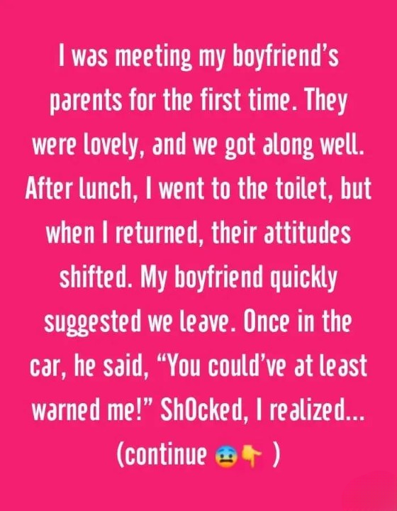 I met my boyfriend’s parents for the first time, and everything seemed to be going perfectly. They were kind, and we connected well. After lunch, I went to the restroom, but when I came back, the atmosphere had completely changed. My boyfriend quickly suggested we leave.