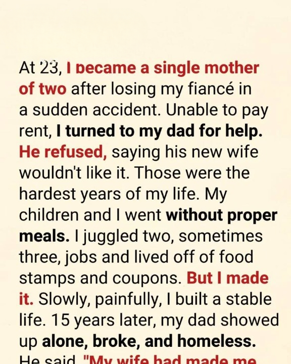 In my lowest moment, I turned to my father—the one person I believed would never turn me away. But he did. Standing in his doorway, he told me his new wife wouldn’t approve and that he didn’t want to disturb the peace in his home. I drove away with my children in the back seat, heartbroken and overwhelmed, questioning how a parent could make that choice.