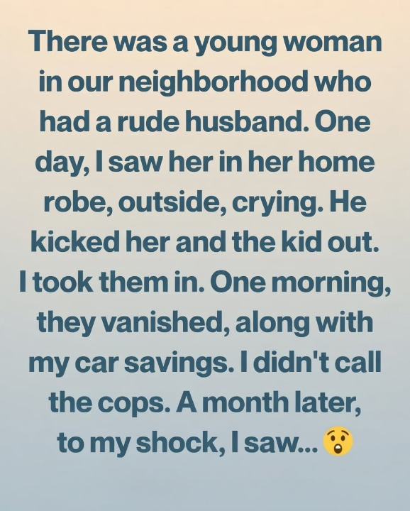 Then, on the eighth morning, they were gone. No note, no goodbye. Only silence. And my envelope of car savings—years of careful money—was missing. My chest tightened. The betrayal stung, not just for the money, but for trusting someone in need. I didn’t call the police. I wanted to believe I hadn’t misjudged her.