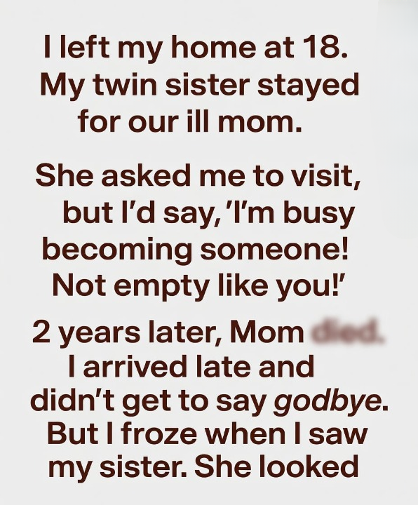 I left home at eighteen with a suitcase, a scholarship, and the belief that moving forward meant never turning back. My twin sister stayed behind to care for our mother as her health declined, and at the time, I saw it as a lack of ambition rather than quiet strength—an assumption I would later regret.