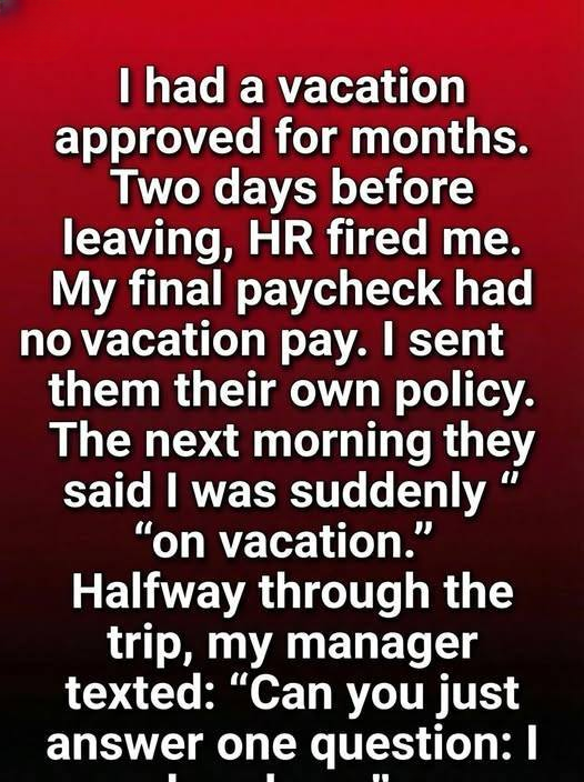 According to company policy, I should have been paid for it. I reached out to HR for clarification, but their response ignored the fact that I had been terminated, insisting I was simply “on vacation.” Instead of wasting energy arguing, I made a decision—I went on the trip anyway.