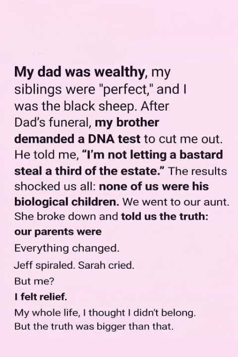 Everything changed after our father’s funeral. Jeff pulled me aside privately, his tone colder than I had ever heard it before. He said, “I’m not letting a bastard take a third of the estate.” His words hit like a blow. He insisted on a DNA test, determined to prove I didn’t belong.