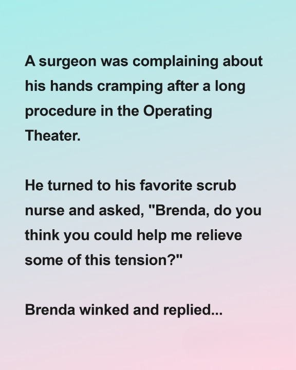 Turning to his trusted scrub nurse, he added with a half-smile, “Brenda, any chance you could help me ease some of this tension?”