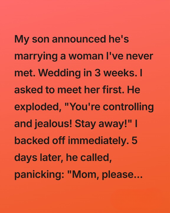 My son shocked me when he announced he was getting married—to a woman I had never even met—and the wedding was just three weeks away. When I gently asked to meet her first, he lashed out, accusing me of being controlling and jealous. His words cut deep, and I backed off, confused and hurt, wondering how I had suddenly become the villain in his life.