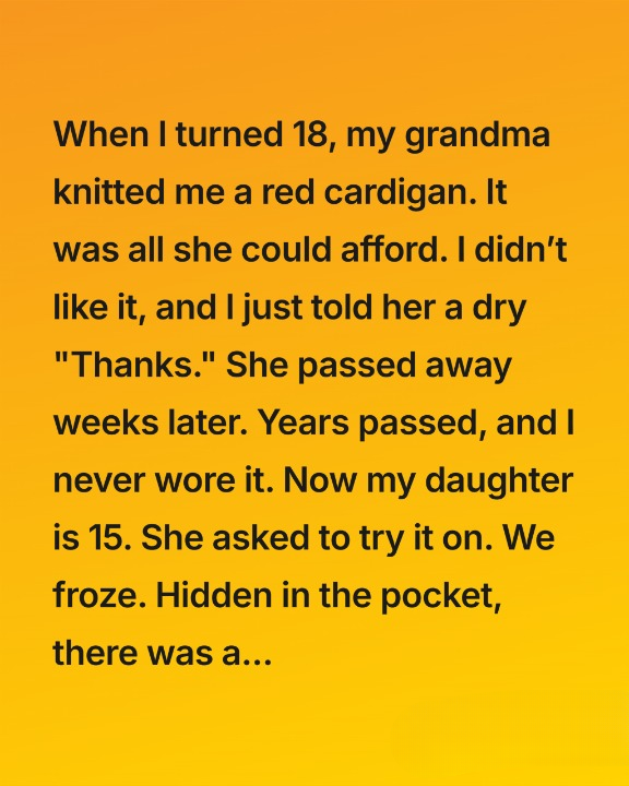 When I turned eighteen, my grandmother gave me a handmade red cardigan she had clearly poured weeks of effort into. She placed it in my hands with a hopeful smile, her fingers stiff with age, her eyes searching mine for approval. It wasn’t stylish or modern—just thick, slightly uneven, and unmistakably knitted by hand.