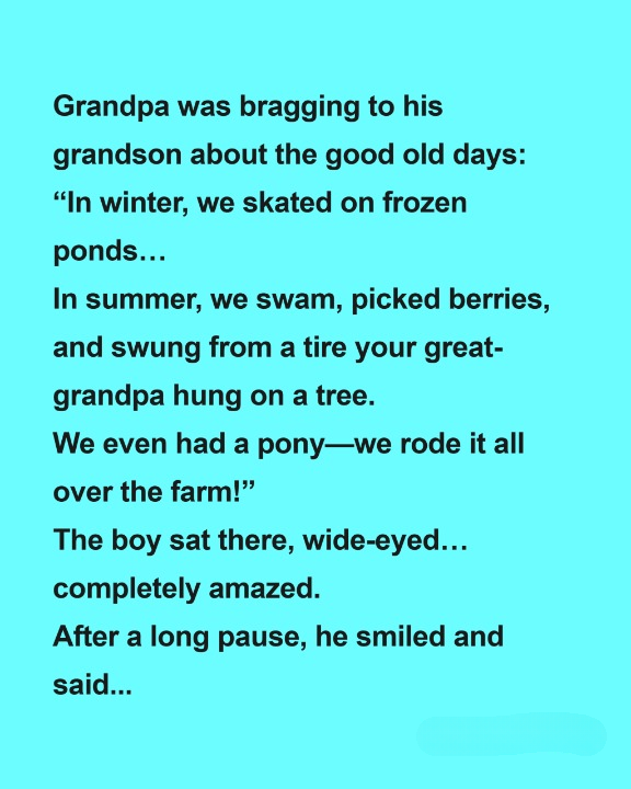 The boy sat there, eyes wide, processing everything he had just heard. In his imagination, Grandpa’s childhood sounded like a nonstop adventure movie—skating across frozen lakes, swinging into the sky, riding ponies through endless fields. It sounded freer, wilder, and more exciting than anything he had ever experienced.
