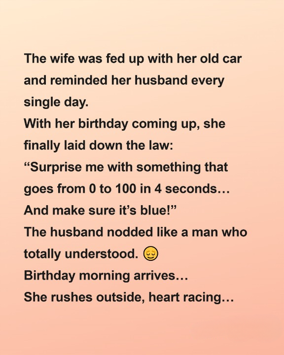 Fed up with her old car, the wife complained to her husband every day until her birthday finally gave her a chance to be very specific about what she wanted.