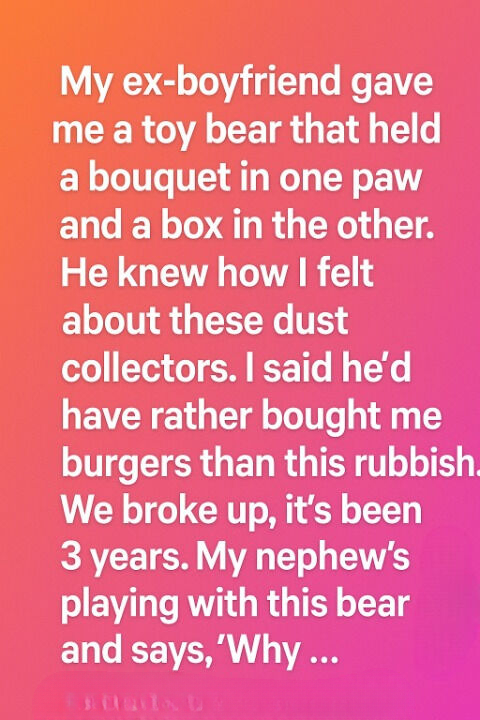 I had kept a small plush bear from an old relationship—one my ex-boyfriend had given me years ago. It was a simple gift: a chubby teddy holding a tiny fabric bouquet and a little box. At the time, I didn’t care much for sentimental things and even joked that I would have preferred something practical instead. After we broke up, I thought I had gotten rid of everything that reminded me of him, but somehow the bear stayed with me through every move, quietly sitting on a shelf I barely noticed.