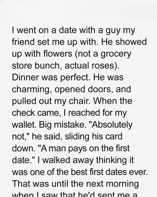 The evening flowed effortlessly. We shared stories, laughed about past dating misadventures, and talked about goals and values. There was no awkwardness, no red flags—just the sense that I might finally be experiencing a truly great first date. When the bill arrived, I reached for my purse out of habit, but Eric stopped me immediately.